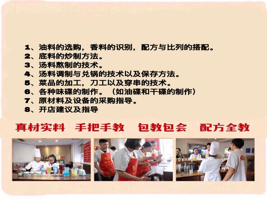 服務(wù)特色:①先試吃再學(xué)習(xí),不正宗退學(xué)費(fèi);②包吃包住,不收取材料費(fèi)用; ③不限制時(shí)間,至到學(xué)會(huì)為止。