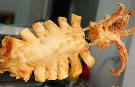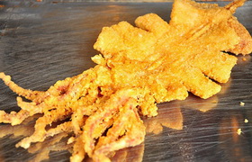 轟炸大魷魚是一道臺灣街頭小吃,主要食材有魷魚、油、鹽、麻辣鮮、脆炸粉、料酒、孜然、芝麻等。