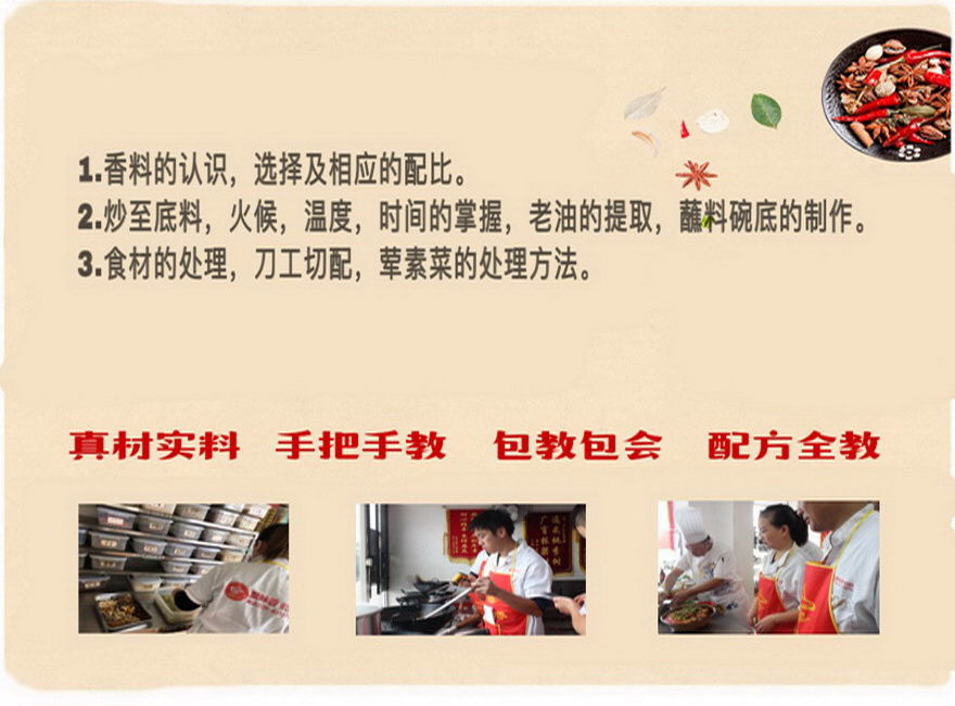 服務(wù)特色:①先試吃再學(xué)習(xí),不正宗退學(xué)費;②包吃包住,不收取材料費用; ③不限制時間,至到學(xué)會為止。