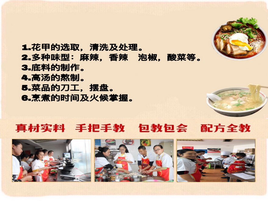 服務(wù)特色:①先試吃再學(xué)習(xí),不正宗退學(xué)費(fèi);②包吃包住,不收取材料費(fèi)用; ③不限制時(shí)間,至到學(xué)會(huì)為止。