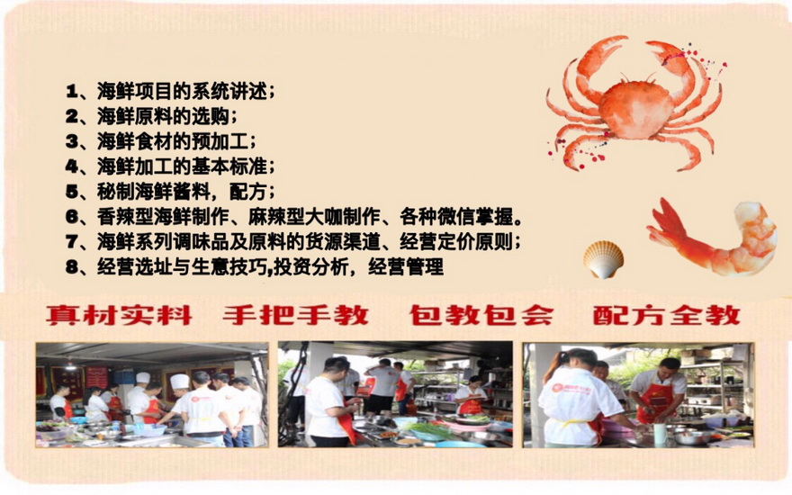 爆炒小海鮮系列我們教爆炒田螺, 爆炒花甲, 爆炒螃蟹, 爆炒魷魚(yú), 爆炒小龍蝦,多種味型滿(mǎn)足廣大消費(fèi)者的口味。