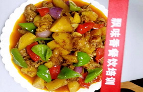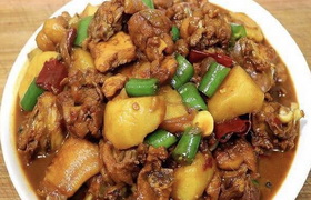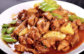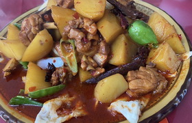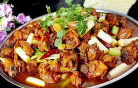 新疆大盤雞又名為沙灣大盤雞,是新疆名菜,起源于20世紀(jì)80年代,主要用料為雞塊和土豆塊、四川粉皮,配皮帶面烹飪而成。色彩鮮艷、爽滑麻辣的雞肉和軟糯甜潤的土豆,辣中有香、粗中帶細(xì),是餐桌上的佳品。口感獨(dú)特、味道新穎,既有西北人喜歡的粗獷豪氣的辣味兒,又融合了老四川人為這瘋狂的舌尖上的麻味兒。