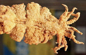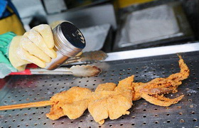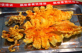 轟炸大魷魚是一道臺灣街頭小吃,主要食材有魷魚、油、鹽、麻辣鮮、脆炸粉、料酒、孜然、芝麻等。